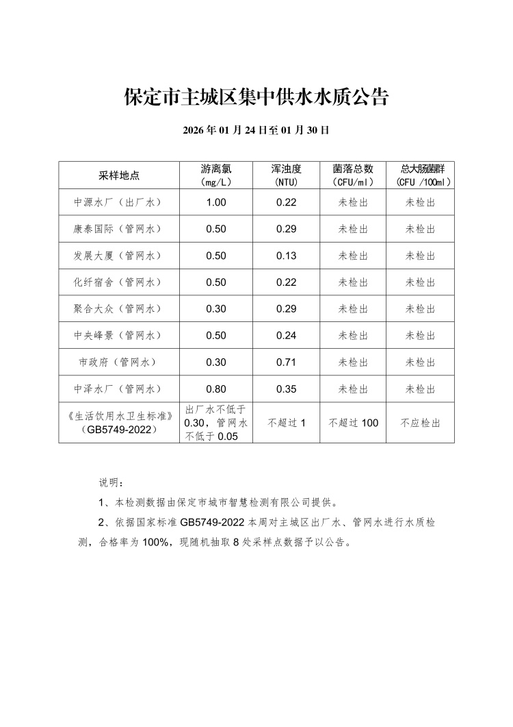 主城區(qū)集中供水水質(zhì)公告(01月24日至01月31日)