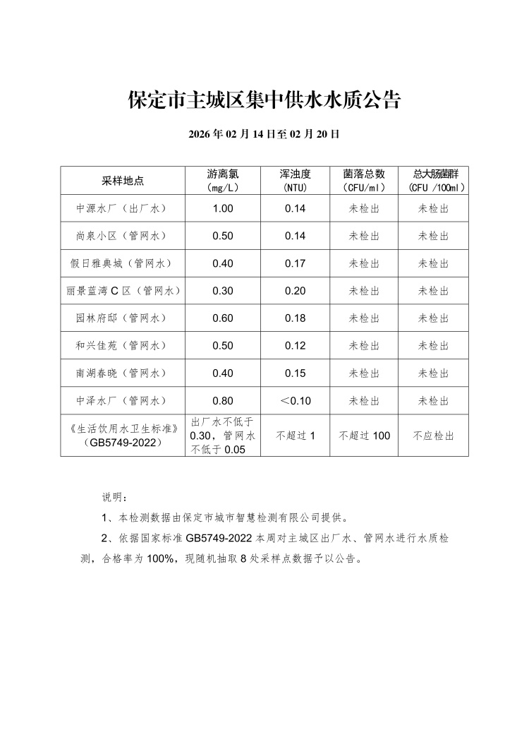 主城區(qū)集中供水水質(zhì)公告(02月14日至02月20日)